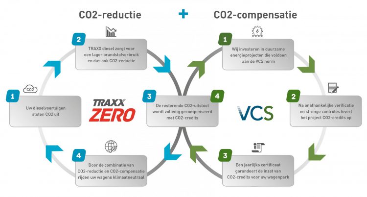 TRAXX is een dieselbrandstof die de verbranding in de motor optimaliseert en zo het verbruik verlaagt – en dus de CO2-emissies reduceert. De resterende CO2-uitstoot wordt volledig gecompenseerd door investeringen in VCS gecertificeerde duurzame energieprojecten. Met deze slimme combinatie van CO2-reductie én CO2-compensatie brengt TRAXX Zero de CO2-impact van dieselmotoren helemaal naar nul.